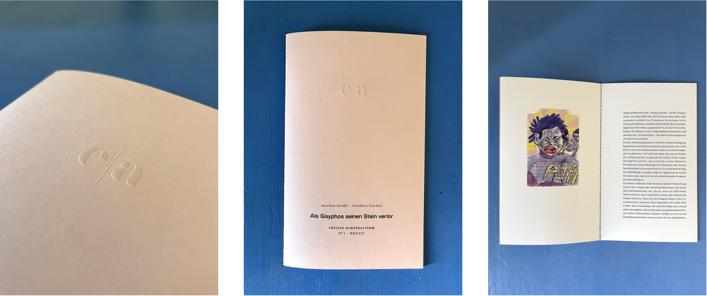 Markus Bundi: Menschen werden von Bildern inspiriert, und seit es Sprache gibt, evozieren Texte in deren Köpfen Bilder. Wenig erstaunlich also, dass das altgriechische Wort Idee nichts anderes meint als »Bild«. Darin trafen wir uns, die Herausgeber der edition aequinoctium schon früh. Claudius Fischer, der Zeichner und Gestalter, und ich, der Wörtermensch. Manchmal als ein scharfer Gegensatz – wie Tag und Nacht –, dann wieder ganz nah beieinander wie die Tag- und Nachtgleiche. Diese Wechselwirkung wollen wir befördern, indem wir sie nach aussen tragen, uns darüber austauschen, welches Tandem aus Kunst und Literatur gemeinsam abheben und fliegen könnte. Und so wird, wenn alles gut geht, auf das kommende Aequinoctium das nächste Heft erscheinen …