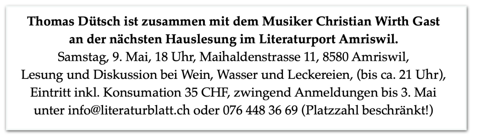 Sa, 4. Mai 2024, 18 Uhr, Amriswil, Maihaldenstrasse 11, Hauslesung bei Irmgard