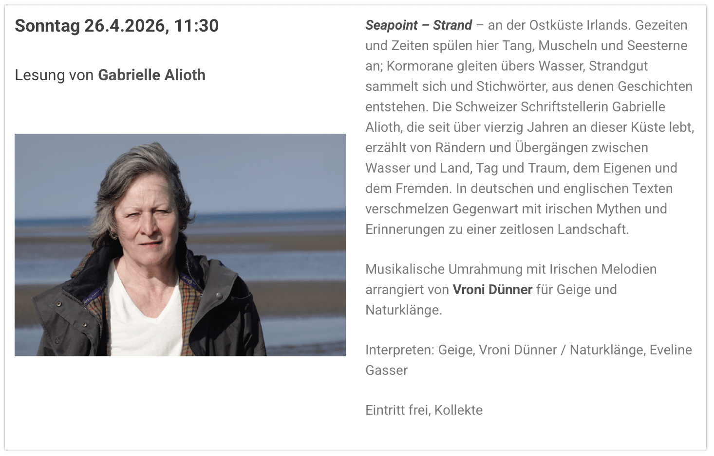 Gabrielle Alioth lebt und schreibt seit Jahrzehnten an der Ostküste Irlands. Die Insel, ein Sehnsuchtsort vieler, spielt einmal mehr die Hauptrolle in einem ihrer Bücher – diesmal in einer düsteren Perspektive, schonungslos und und ungeheuer stimmungsvoll. „Die letzte Insel“, ein Roman über das Ende.